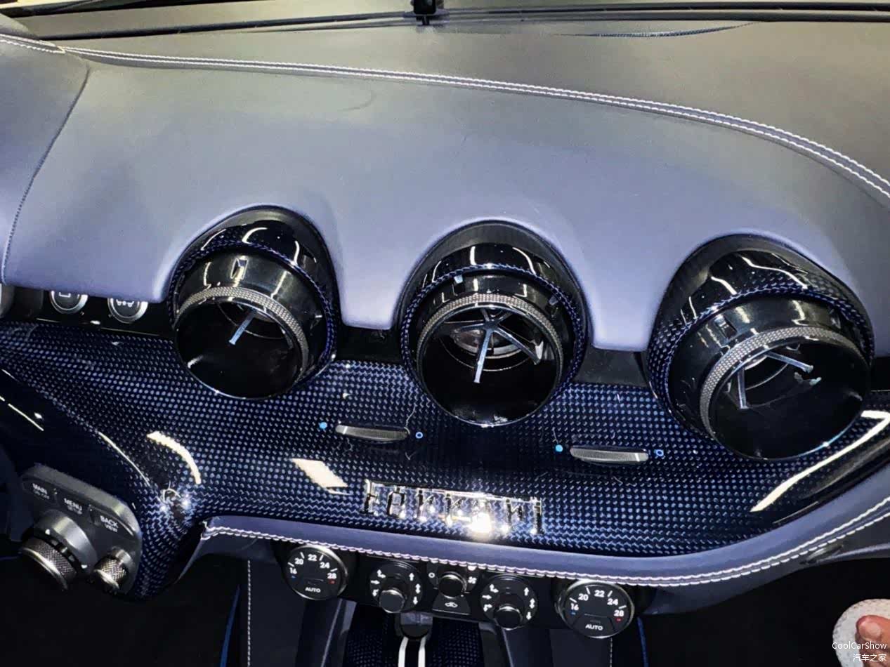 这台车设计非常独特,车身采用白色漆面搭配蓝色的点缀元素,包括了蓝色的拉花、碳纤维饰件以及轮毂等等。内饰则采用海伦蓝色顶级皮革与灰白色科瓦德拉特制帆布相间的座椅设计,方向盘还有“马到功成”的中文字样。