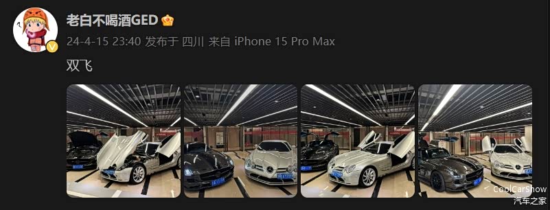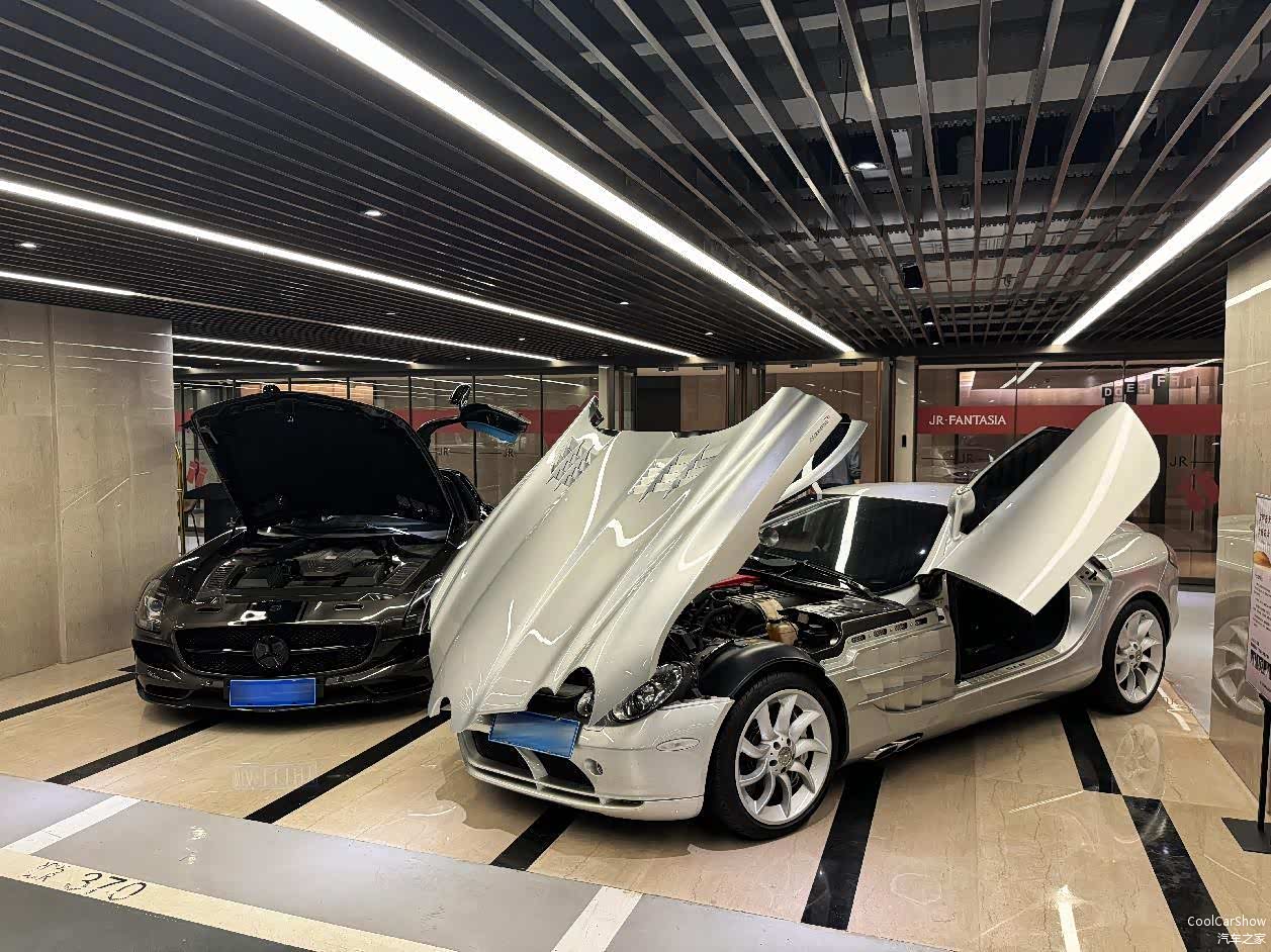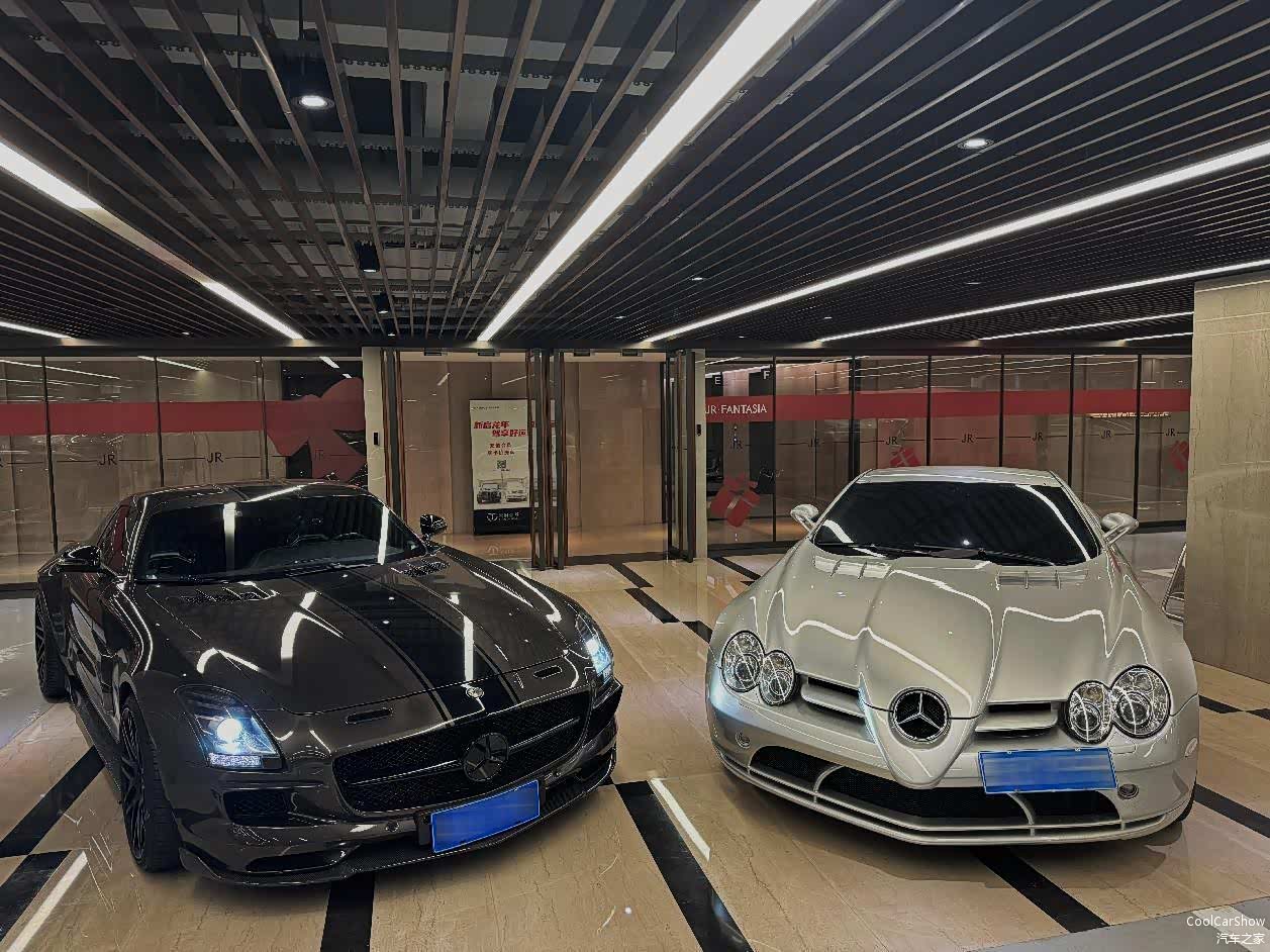 除了以上这些千万级的豪车、超跑之外,老白还有一些老车。例如两台一起“双飞”的德系超跑,分别是一台SLS AMG( 45周年纪念版)和迈凯伦与奔驰的杰作SLR。估计国内能同时拥有这两款车的人也并不多。