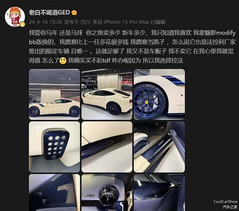 当然,老白车库里的车远不止这些,但从他这些座驾来看,上到千万级、下到几十万的车,新的超跑豪车,老的经典车他都拥有,可以玩车这方面也是相当在线的。同时,在处理“锁车”这件事上,也能看到他的格局之大。如果是你遇到类似的事情,会怎样解决呢?