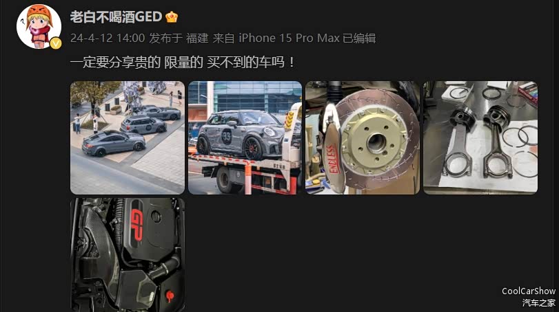 “小不点”的三门版MINI也是老白的心头好,不过这并不是普通的MINI,而是配置到顶的MINI JCW,还有包括浑身碳纤维、ENDLESS刹车、Öhlins 避震以及OZ轮毂在内的改装件。