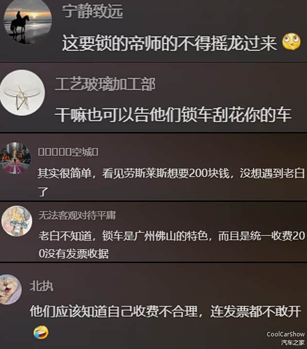 现场的保安人员却告知老白需要缴费200元“停车费”才能开锁,当时老白也愿意了,但提出要发票的需求,则被对方拒绝。多次无果的沟通后,老白最终决定报警。经过蜀黍一番调解后,这场锁车风波才得以解决。详情可参见老白个人账号所发的视频。