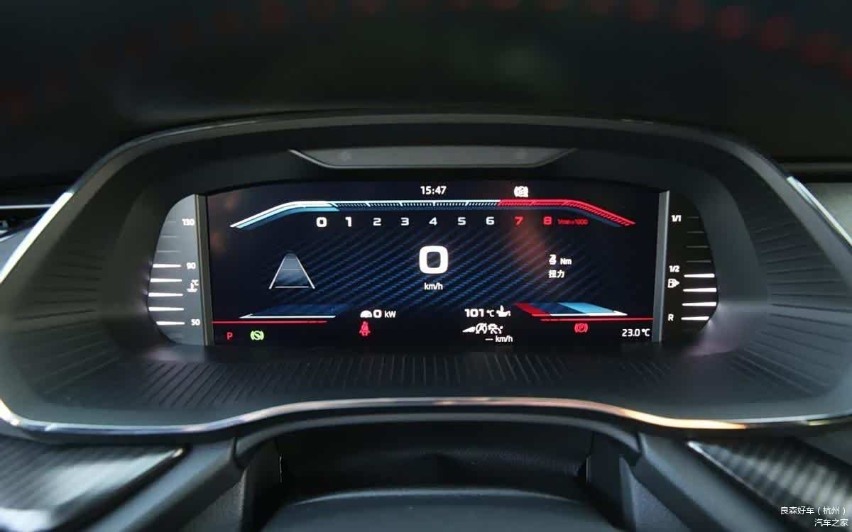 10.25寸数字仪表新增第五种运动模式显示,同时所有模式皆加入碳纤维纹路背景妆点。