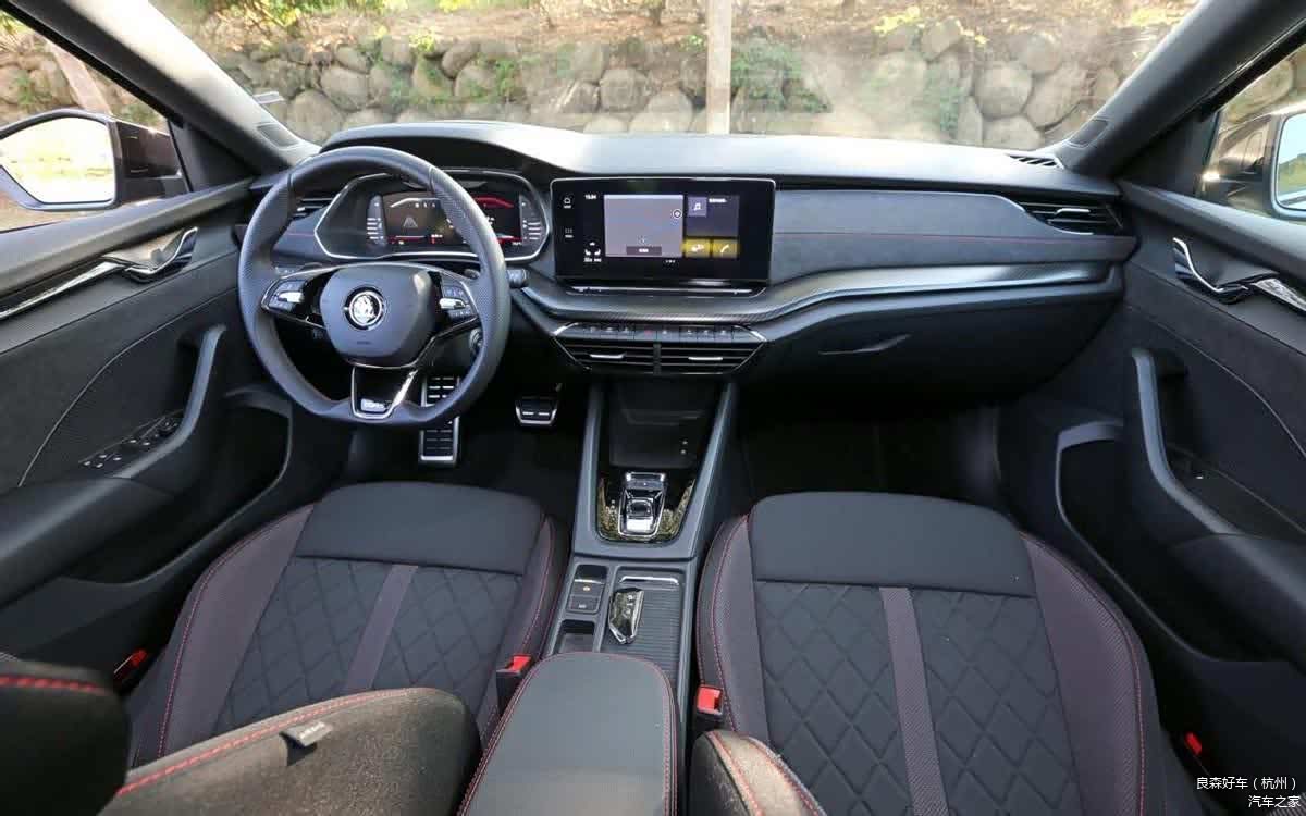 延续外观设计手法,明锐RS在内饰上同样也能让人一眼看出跑车身份,首先是中控台部分采用Alcantara包覆搭配碳纤维饰板,与一般车型的丹宁布纹材质+铝质点状纹路饰板大异其趣,此外还换上带有vRS专属徽饰的跑车式平把方向盘、跑车座椅、门槛踏板,以及金属踏板组和多处红色缝线等,就连10.25寸数字仪表都新增第五种运动模式显示,同时所有模式皆加入碳纤维纹路背景妆点,可说是各处细节都不放过。