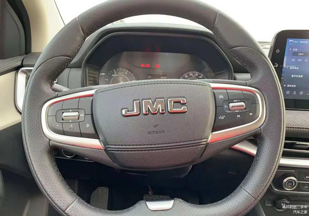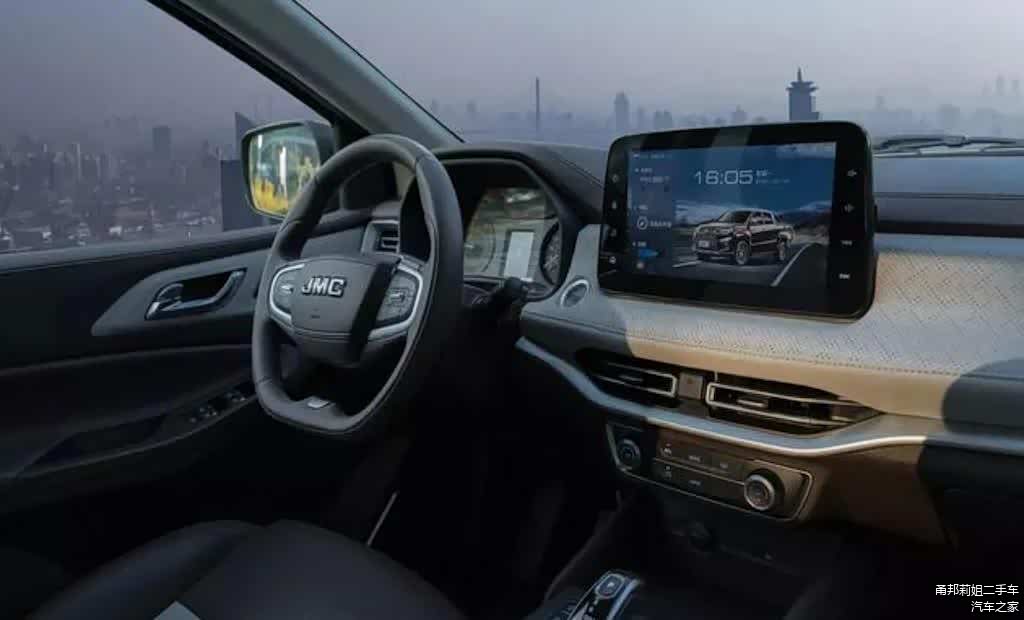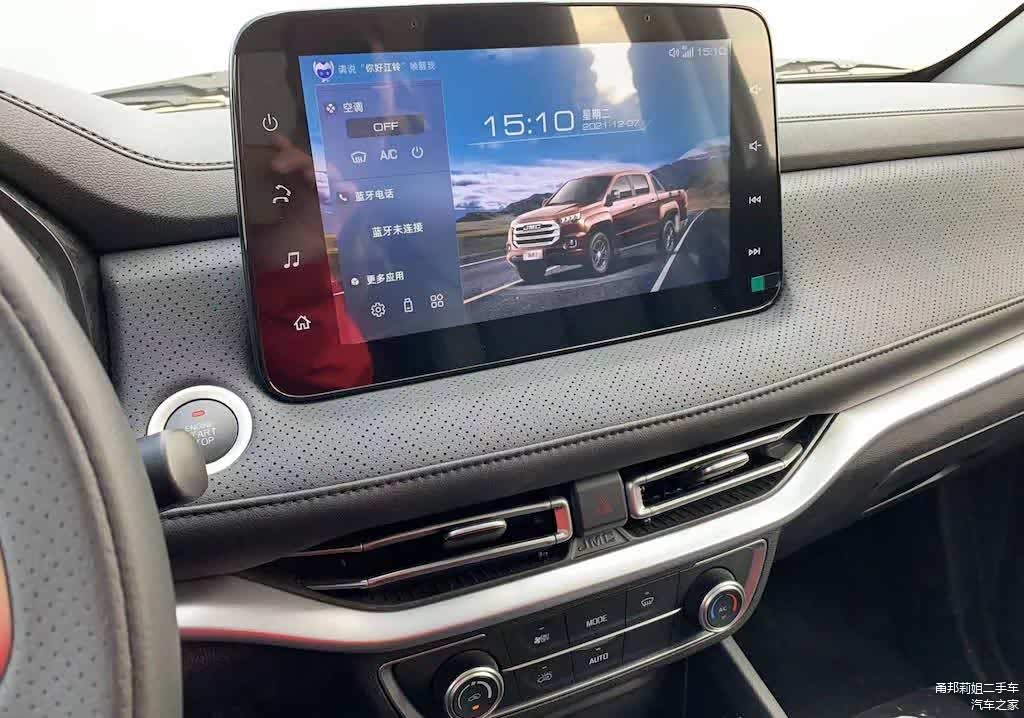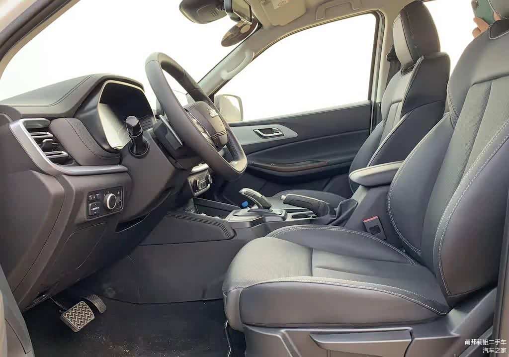 内饰方面,进入车内,新车的内部其实比外观更“惊艳”,都有点怀疑我是在热销SUV的车内试驾“皮卡”。具体来看,新车内饰风格其实和乘用车差不多,车内大面积被皮质材料覆盖,很有豪华大气的感觉。新车的内饰有两种配色风格,一个是纯黑色,一个是棕白双色。我们试驾的这款车就是拼色设计的,其实这个配色一旦设计的不好,很容易让人感觉“俗气”;而新车的撞色却让人感觉很时尚,这一点也让人觉得挺惊喜的。