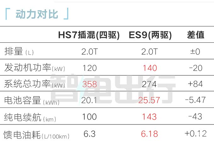 HS7 PHEV发动机最大功率120kW,峰值扭矩260N·m,前/后驱动电机最大功率分别为168/70kW,峰值扭矩分别为340N·m和160N·m,系统总功率358kW,匹配20.1kWh宁德时代三元锂电池,CLTC纯电续航里程100km,综合续航里程1102km,支持3.3kW外放电。
