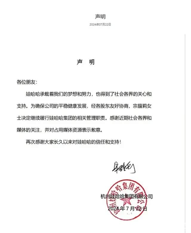 不过,宗馥莉最终还是得到了股东们的支持,继续履职。请辞7日后,7月22日,娃哈哈官网发表声明称,宗馥莉女士决定继续履行娃哈哈集团的相关管理职责。
