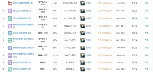 据天眼查数据显示,宗庆后持有14家公司的股权,除了娃哈哈集团,还持有浙江启力投资有限公司60%股权、杭州萧山宏盛食品有限公司60%股权,浙江真宗投资有限公司60%股权、杭州娃哈哈宏振投资有限公司100%股权等等。