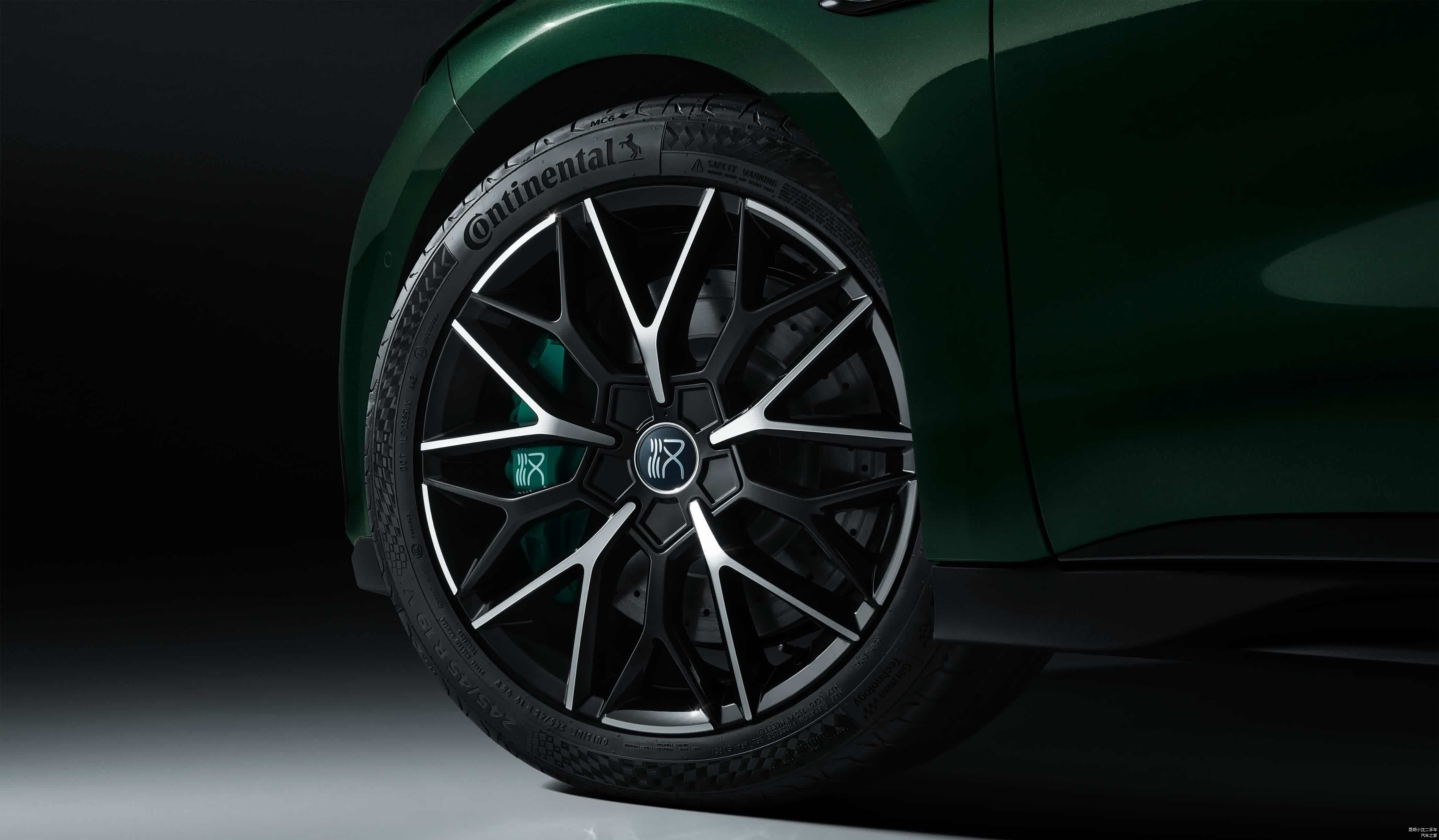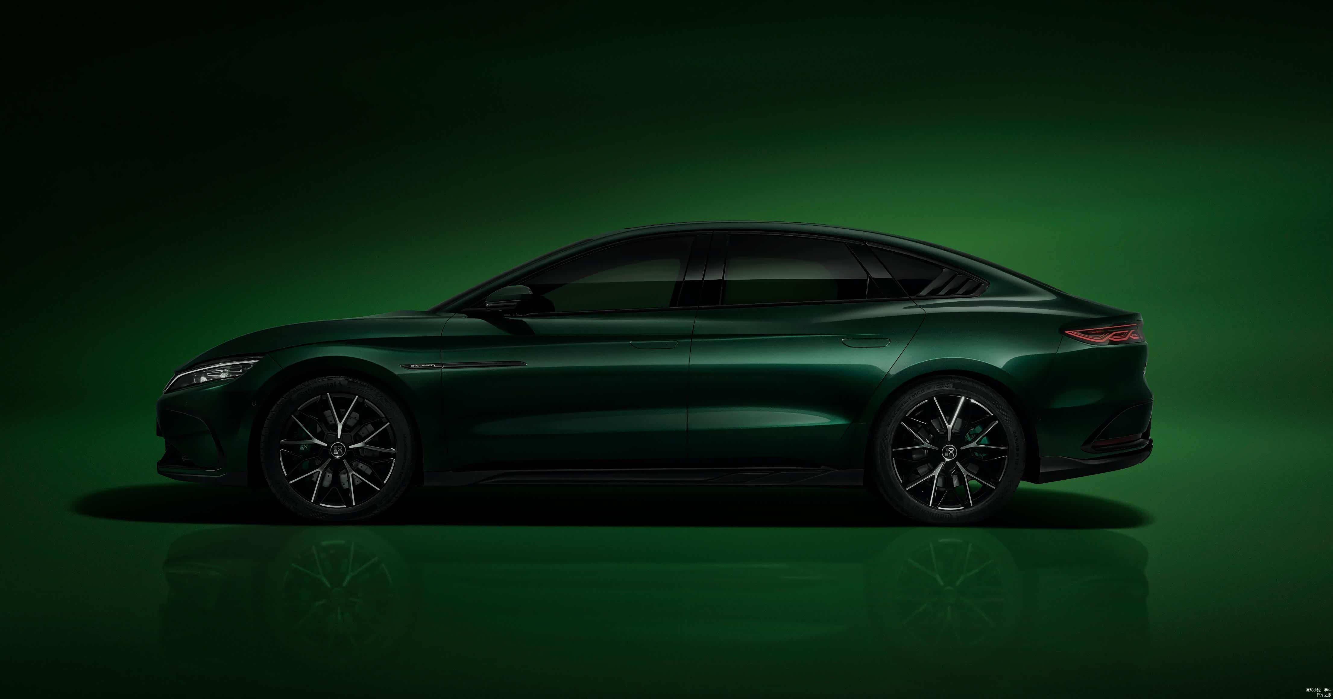 来到车身侧面,汉EV千山翠限量版的车身线条营造出了分明的层次感,简约的几笔线条勾勒,让整个光影效果在自由流转间呈现着独特的设计美感。在诸如轮毂、后视镜下方BYD Design的铭牌、窗沿、C柱龙爪的位置等处,汉EV千山翠限量版同样运用熏黑处理,与前脸相呼应,刹车卡钳则使用了石绿色,更生动亮眼。