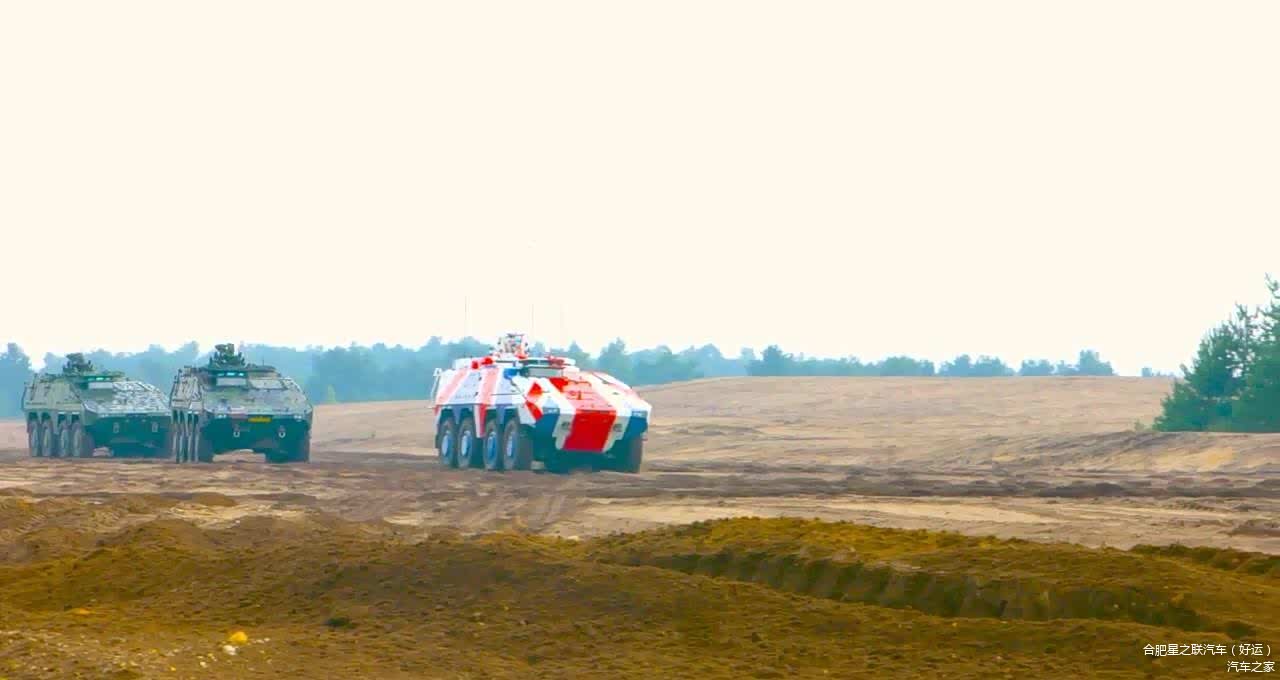 拳击手装甲车则是8×8装甲车中的重量级选手,它的战斗全重达到了33吨,可以使用多种口径的机炮,火力和装甲防护能力比很多履带式步兵战车都要优秀,它的尺寸也非常大,长度为7.88米,宽度2.99米,高度2.37米。
