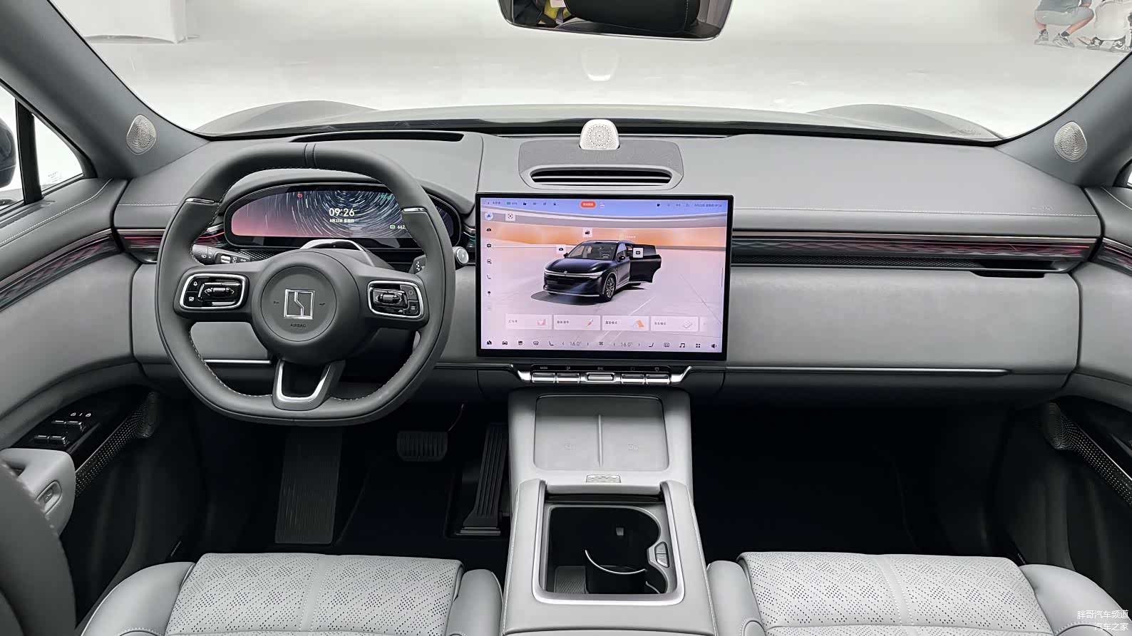 进入车内,极氪7X的内饰设计同样令人眼前一亮。环抱沉浸座舱设计以硬朗的走线贯穿整个仪表台,形成纯粹而极富视觉层次的环抱式空间。中控区域配备了13.02英寸液晶仪表屏幕和15.05英寸中控屏,均采用Mini LED面板,并搭载8295芯片。中控屏下方还配备了5颗实体按键,包括驾驶模式选择、尾门开关、音量旋钮等,方便驾驶者进行快捷操作。