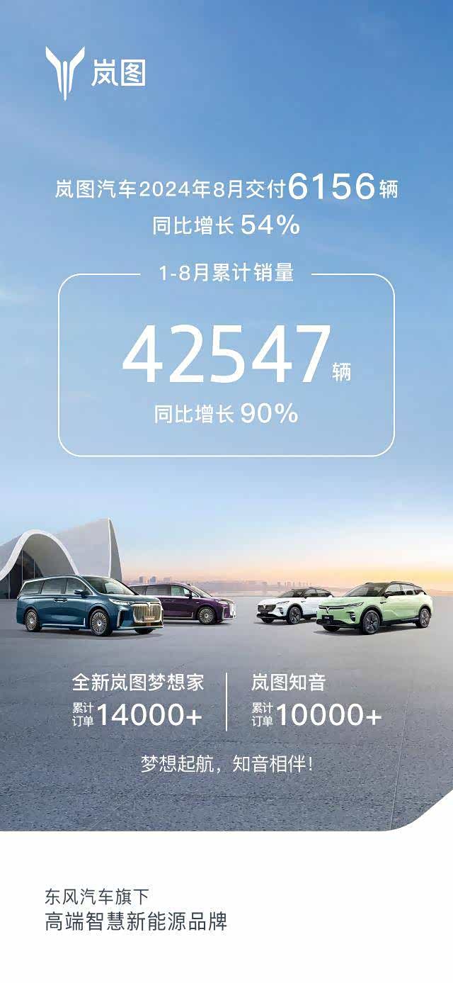 9月1日,岚图汽车公布2024年8月交付数据。8月,岚图汽车交付新车6156辆,同比增长54%,1-8月累计交付42547辆,同比增长90%。凭借卓越产品力和体系能力,岚图汽车月销量实现“四连涨”,高质量稳步向前。与此同时,全新岚图梦想家、岚图知音8月底相继开启预售,双车订单4天破2.4万。通过不断加强产品攻势,岚图汽车积极抢抓市场机遇,势必持续助力9月销量增长,推动全年销量再创新高。