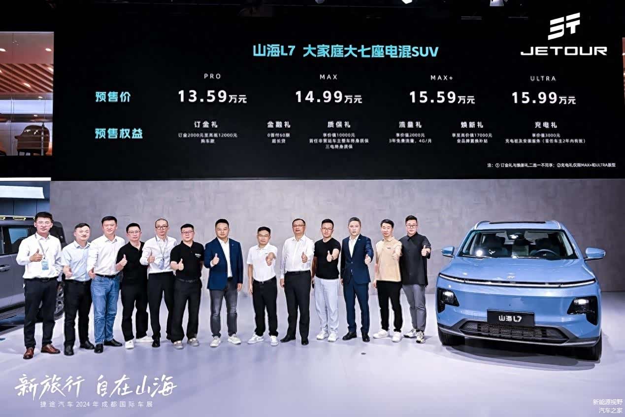 2024年8月30日奇瑞 捷途山海L7(图片 | 参数 | 询价)在成都车展亮相并预售,新车共推出5款车型,预售价13.59万元--15.99万元,定位于中型SUV,预计将于2024年下半年上市。动力上,搭载1.5T插电式混动系统。