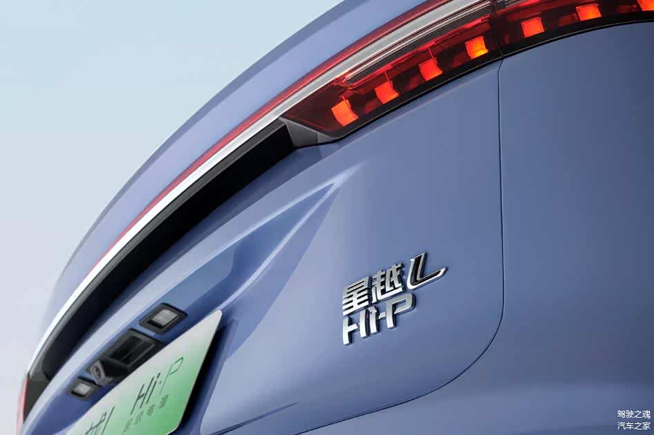 汽车尾部,吉利星越L 增程电动版依旧是我们熟悉的吉利风格,不过在右下角添加了HI-P的标识,表明自己新能源车型的身份。
