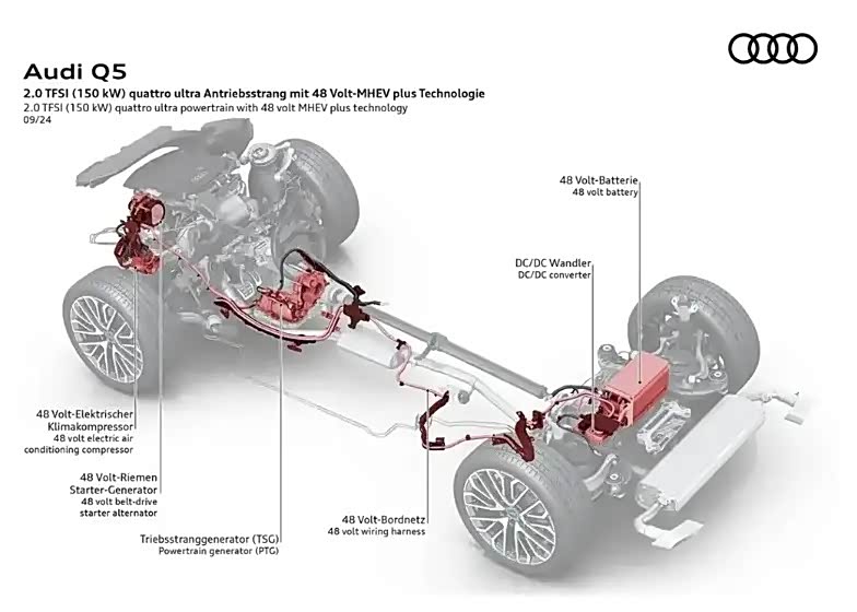 动力系统与轻混技术也是全新奥迪 Q5 的一大亮点。PPC 框架集成了发动机结构及 MHEV plus 应用技术,全系列默认配置加强版 48V 轻混电机,采用 PTG 动力传动,产生 230Nm 扭矩和 24 马力功率,优于传统 48V 轻混。48V 轻混发电机配备空调压缩机,即使在发动机关闭时也能确保空调全功率工作。MHEV plus 系统配备磷酸铁锂储能装置,PTG 轻混电动发动机可为发动机启动和电池充电,轻混可实现短距离纯电模式,减速时动能回收功率达 25kw,为电池快速充能。