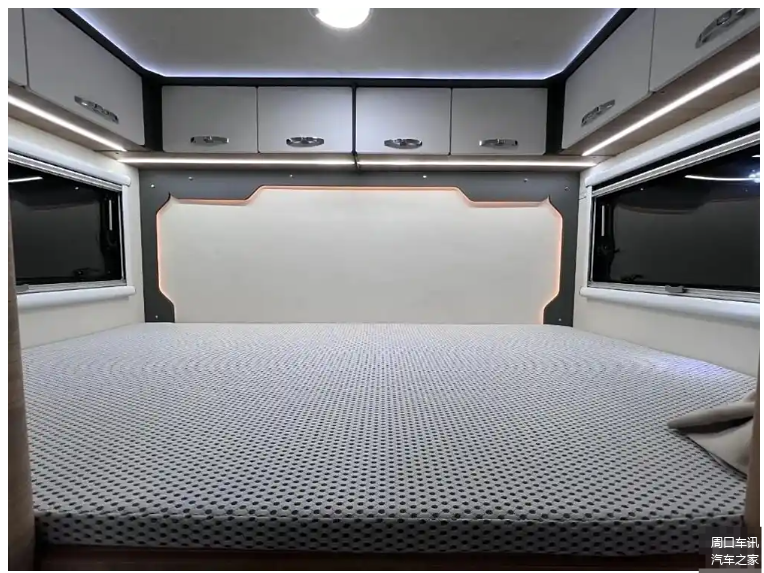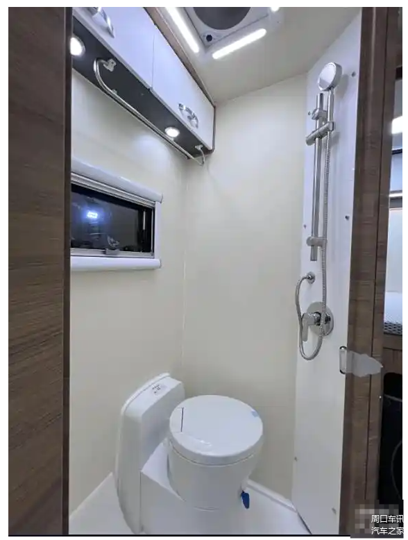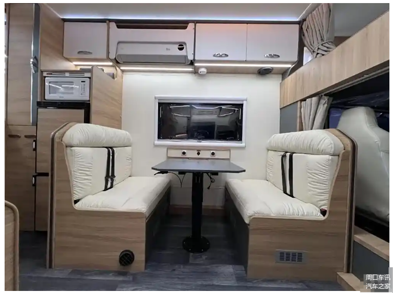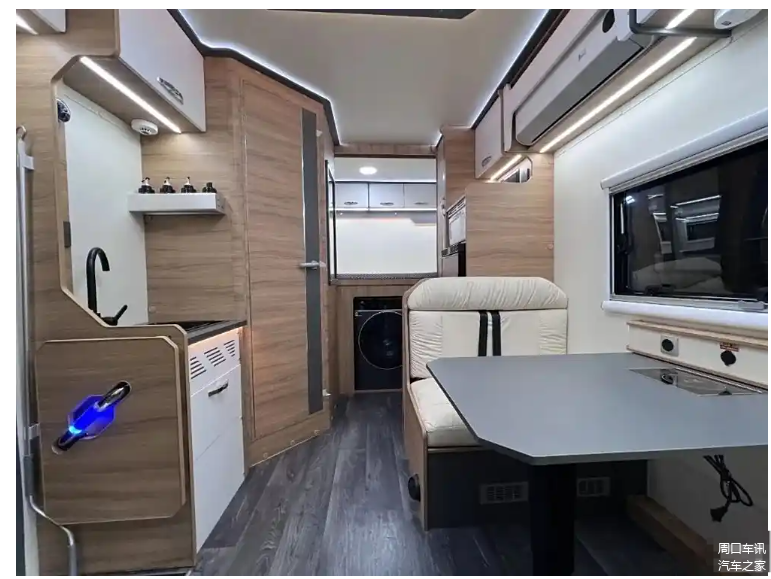 进入生活区,4 座对排沙发与主副驾共 6 座,核载 6 人。沙发间可升降桌板一侧有充电接口,降下桌板沙发可拼成床。车窗上侧吊柜多,实用性强,还有微波炉。车门两侧配备水龙头、洗菜池、电磁炉等厨房设施。车辆后方,左侧有洗涮间,正前方是洗衣机,上方还有一张大床。车尾大床宽敞,车顶吊柜丰富,灯带多样。洗漱间有抽水马桶等设施。