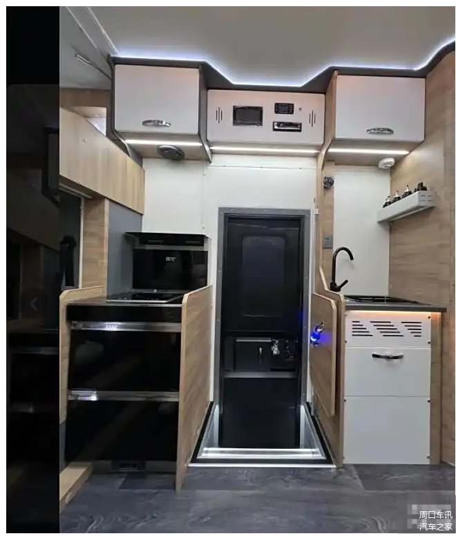 尺寸方面,长宽高为 5995 毫米、2400 毫米、3200 毫米,轴距 3308 毫米,车内空间充裕。驾驶区与生活区独立,生活区车门在右侧后方,虽位置较高但有隐藏式脚踏板。内饰设计简洁,有科技感,但用料多为硬塑料。它比燃油房车更安静,增程器工作时声音与振动都不大。