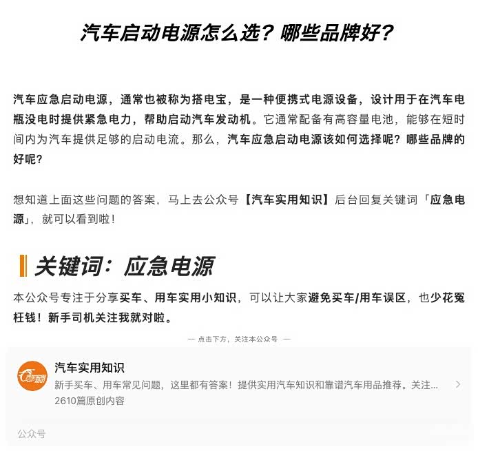 有些车主朋友会随车备一个应急启动电源,特别是在长途旅行时非常方便。如果车子打不着火,只需要用启动电源连接电瓶,按下启动按钮,车子就能恢复动力,非常省事。