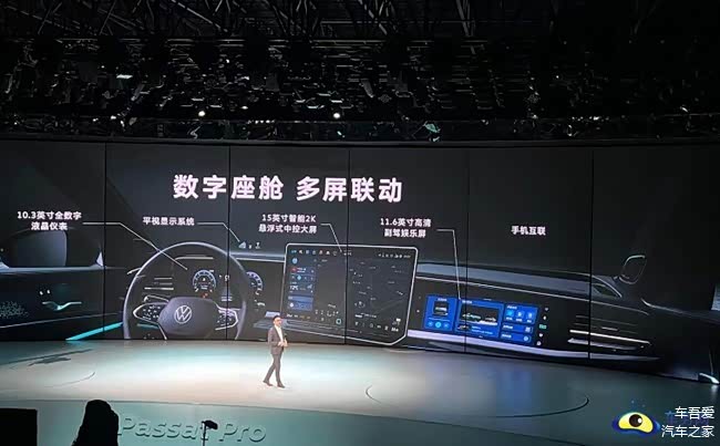进入车内,帕萨特 380TSI 家族的内饰给人一种科技与豪华相融合的感觉。10.3 英寸全数字液晶仪表盘、15 英寸智能 2K 悬浮中控屏以及 11.6 英寸副驾娱乐屏组成的三屏设计,大大提升了整个座舱的科技感。车机系统搭载了高通 8155 车规级芯片,配合科大讯飞语音方案,实现了便捷化操作。此外,上汽大众还和百度文心一言大模型展开深度合作,提供车载全知大语言模型服务,为用户带来贴心的智能用车客服和百科老师。