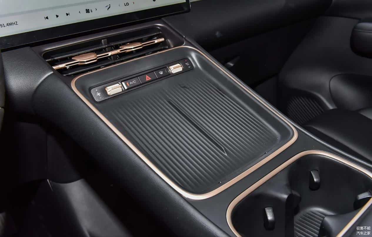 中控屏下方设置有两个放手机的面板和杯架,不过并未配有无线充电。