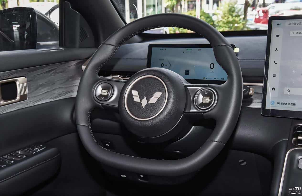 中央扶手区域加入了木纹饰板装饰,车内大部分可接触部位都采用软包皮面,方向盘采用上下平底的双幅设计。