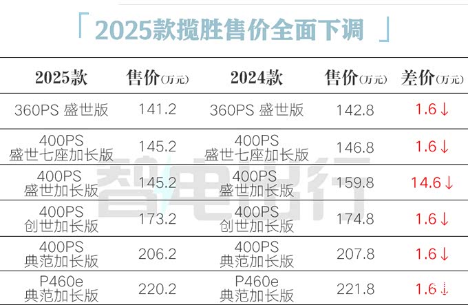 路虎2025款 揽胜(图片 | 参数 | 询价)上市,官方售价区间141.2-220.2万元,与2024款相比,400PS盛世加长版价格下调14.6万元,其他车型价格下调1.6万元。新车全系引入e+娱乐互联系统,取消百度CarLife、前后排吸烟套件(选装),P460e百公里综合油耗1.78L,比2024款更低。