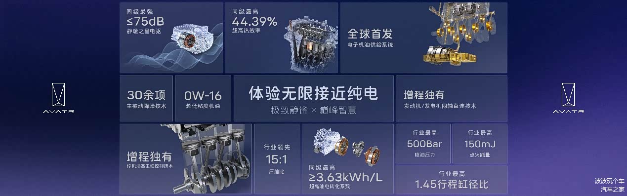 举个例子,阿维塔最新昆仑增程所采用的那台增程器,缸径冲程比能够达到1.45。这是个什么概念?传统燃油车的缸径冲程比在1.1-1.2左右,插混车在1.3左右。缸径冲程比做大意味着能够帮助提高压缩比,燃油的燃烧更充分,也会有更高的热效率。阿维塔这台增程器的热效率达到了44.39%,发电效率达到3.63度/升,已经是行业里的顶尖水平了。