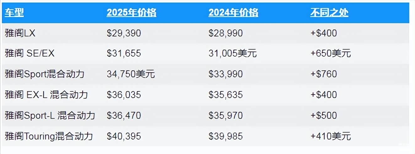 近日,2025款本田雅阁在美国上市,外观和内饰没有发生变化,配置有所提升,新增了一款SE车型,具有黑色外观、加热座椅和天窗。新款雅阁价格全面上涨,售价29,390-40,395美元,涨幅在 400 美元至 760 美元之间。