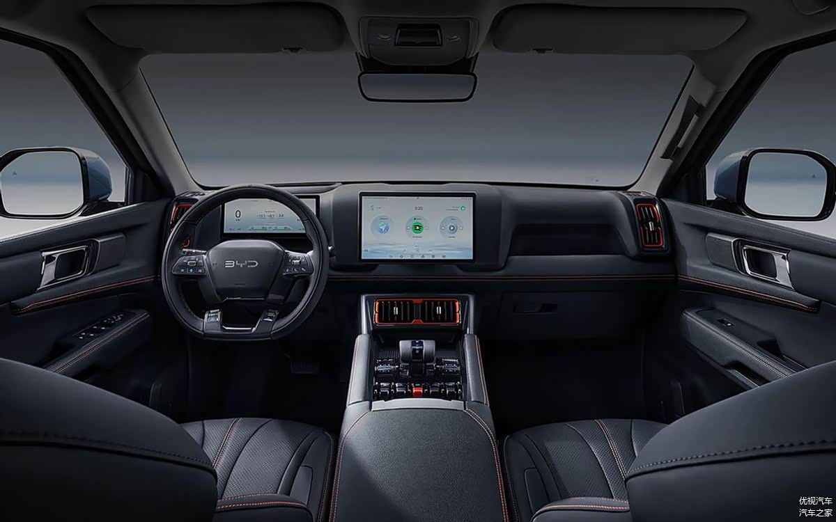 内饰方面,由于这款SHARK皮卡本就是基于方程豹DMO超级混动越野平台所打造,因此它的中控台造型也采用了类似方程豹的设计。配有比亚迪经典的可旋转式12.8英寸大屏和10.25英寸液晶仪表以及12英寸的W-HUD抬头显示屏。