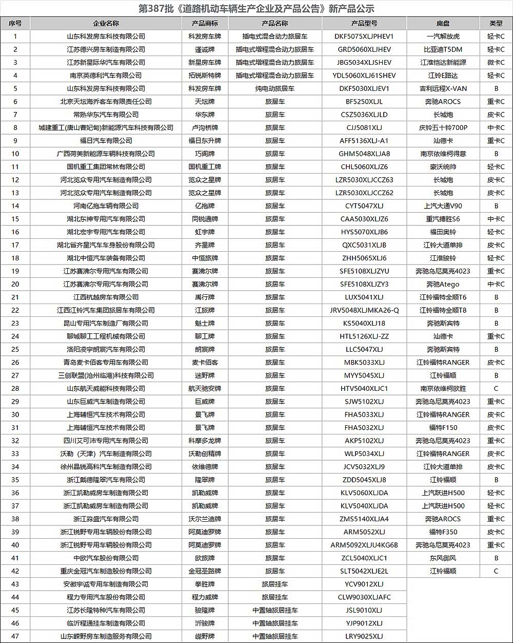 近日,工信部公布了387批次旅居车公告,包括47款新车型,涉及42款旅居车(自行式房车)及5款旅居挂车。