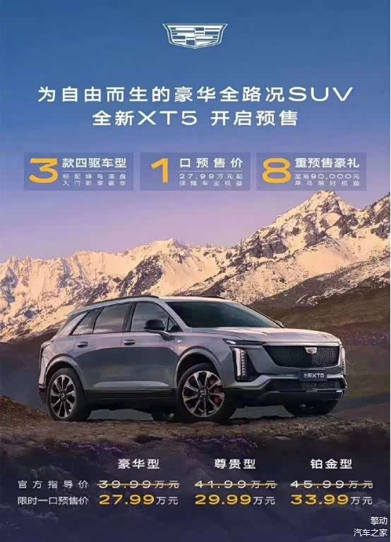 现在的合资车都怎么了?一个两个的几乎都开始大降价了,这是彻底被卷入这个“卷”的洪流中了。9月14日,凯迪拉克全新 XT5(图片 | 参数 | 询价)正式开启预售,新车共推出三款车型,官方指导价为39.99万-45.99万元。但是!官方直接给预售价降了12万,限时一口价为27.99万-33.99万。