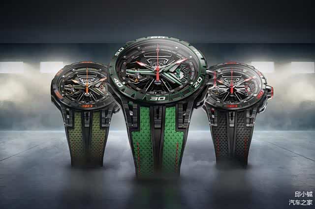 罗杰杜彼携王者竞速系列飞返计时码表,同样有燃擎绿色为主色调的表款。细节方面,表盘上的条杆采用了“Y字型”设计,并填充 Super-LumiNova超强夜光涂层,这与全新兰博基尼SC63赛车的车灯相呼应,尤其在夜间有着独特的夺目效果。