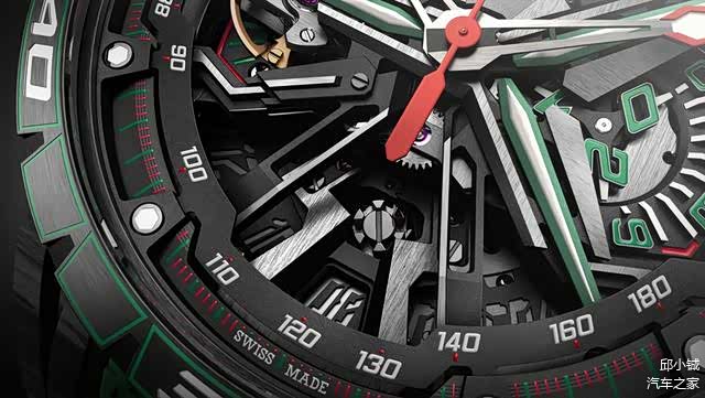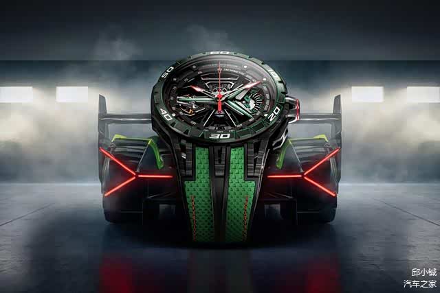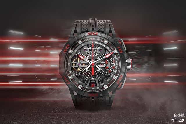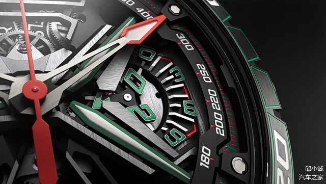 腕表直径达到了45毫米,碳纤维材质的表壳,加上部分零件采用了陶瓷材质,整体佩戴感受非常轻盈,这两种材质也是超跑中常用的。摆陀采用五幅式“Y字型”设计,与跑车轮毂如出一辙,很容易让人联想到兰博基尼超跑。橡胶表带上的“小三角”纹理,仿佛轮胎驶过后留下的痕迹,不仅佩戴舒适,而且更彰显运动。