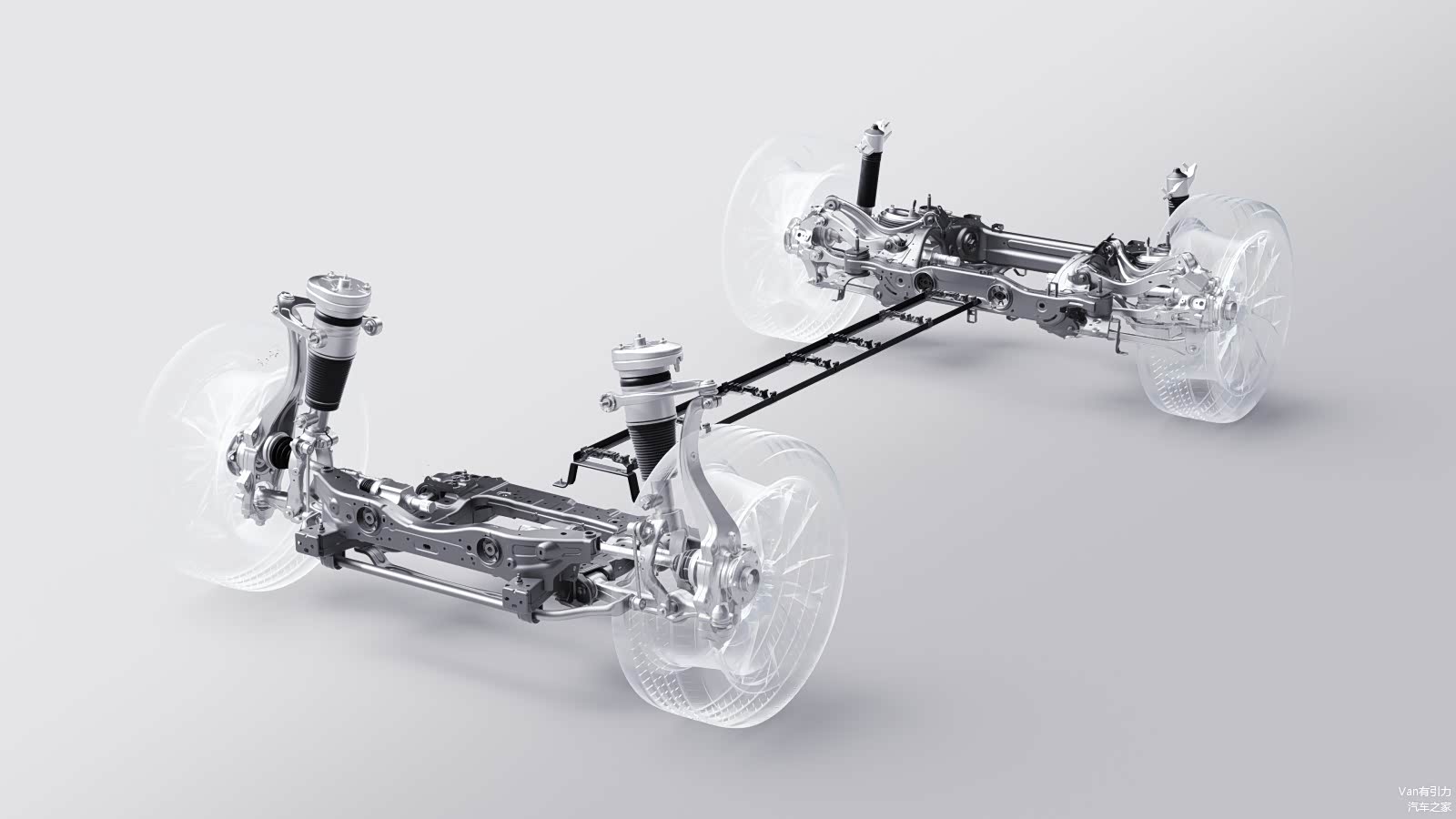 底盘方面,该车全系标配前双叉臂、后五连杆独立悬架,26.99万元的长续航四驱版升级为CCD电磁减震和空气弹簧。后者的高度调节范围为70毫米,满载工况离地间隙最高可达230毫米(非空簧版本为191mm)。