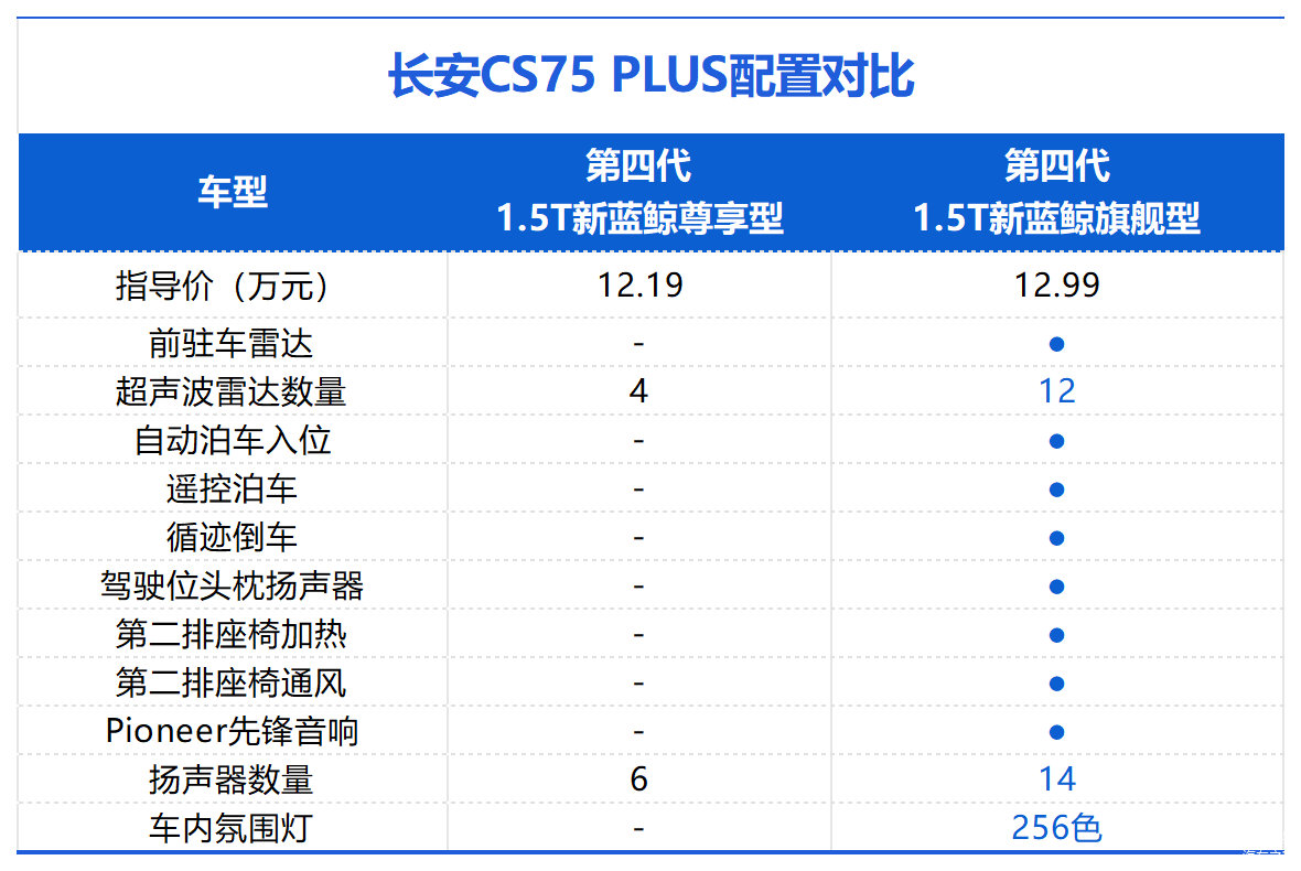 新款CS75 PLUS的两款车型相比,价格相差8000元,高配车型多了前驻车雷达、12个超声波雷达、自动泊车、遥控泊车、循迹倒车、前排多层隔音玻璃、副驾座椅按摩、驾驶位头枕扬声器、第二排座椅加热/通风、Pioneer先锋音响以及256色车内氛围灯。