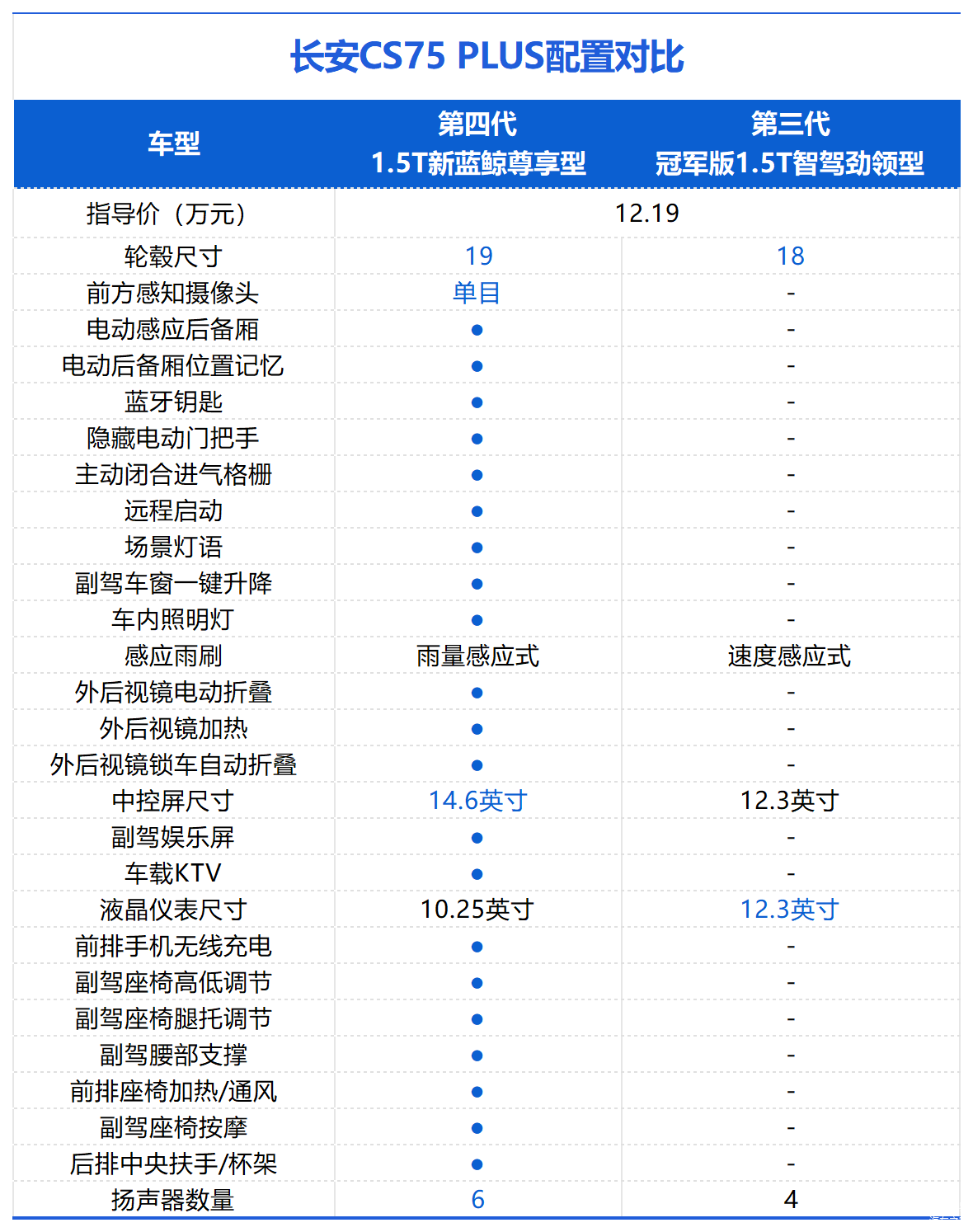 最后再来看配置方面的变化。与老款车型相比,新车在配置上有了非常明显的提升。1.5T新蓝鲸尊享型相比第三代冠军版1.5T智驾劲领型价格一致,配置方面多了电动感应后备厢、隐藏电动门把手、远程启动、外后视镜电动折叠/加热/锁车自动折叠、12.3英寸副驾娱乐屏、前排50W手机无线充电、副驾座椅腿托调节/腰部支撑/电动调节、前排座椅加热/通风、驾驶位座椅按摩、后排中央扶手/杯架等。