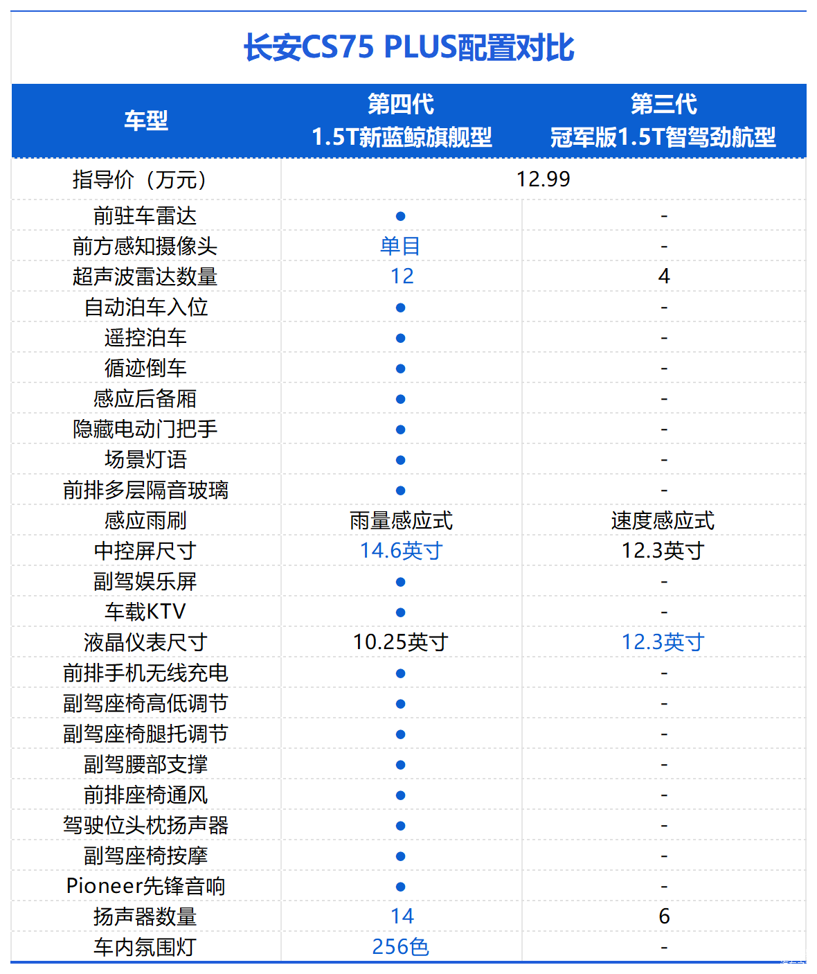 1.5T新蓝鲸旗舰型相比第三代冠军版1.5T智驾劲航型同样价格不变,配置增加了前驻车雷达、单目前方感知摄像头、自动泊车、遥控泊车、循迹倒车、感应后备厢、隐藏电动门把手、前排多层隔音玻璃、车载KTV、第二排座椅加热/通风、副驾零重力座椅、Pioneer先锋音响以及256色车内氛围灯。