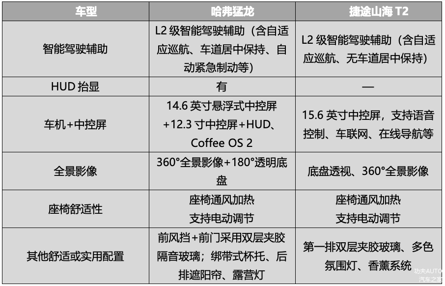 总体而言,功夫汽车认为,捷途山海T2更适合日常家用,而哈弗猛龙则在兼顾家庭出行的同时,尤其适合那些追求更远距离、更复杂路况探险的用户。两款车型各有侧重,也携手为中国品牌“方盒子”SUV,开拓出了更具前景的市场。