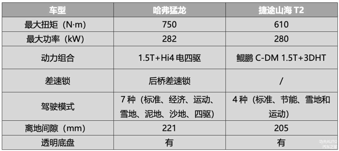 在轻越野性能的对比中,我们首先关注了两款车型的驱动系统和底盘通过性的一些基本信息。