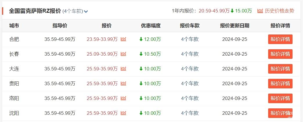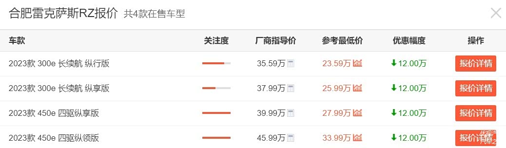 至于价格,雷克萨斯RZ的指导价是35.59-45.99万元,目前终端最低仅售23.59-33.99万元,最高优惠12万,全国大部分地区优惠在8-10万,整体也还是具备有一定性价比的。