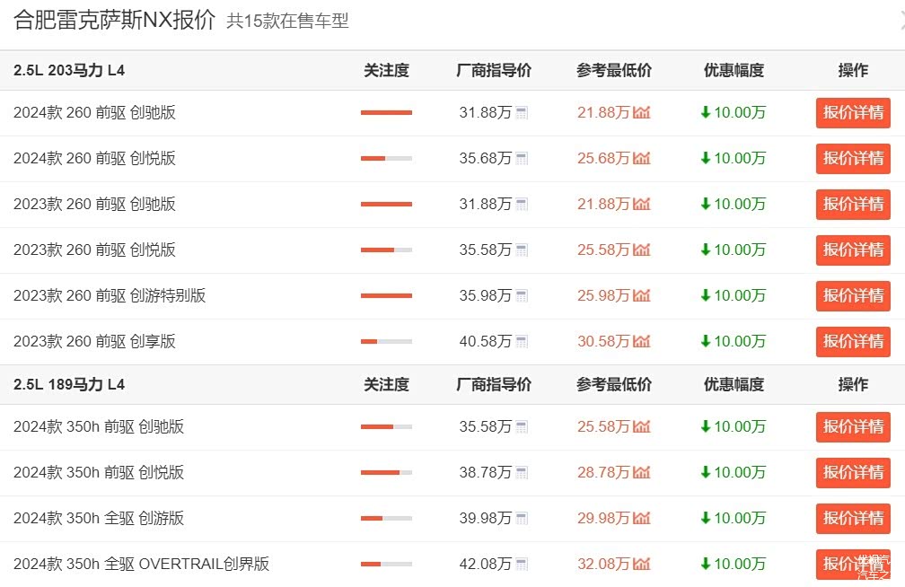 具体来看到价格,雷克萨斯NX的指导价是31.88-54.88万元,目前终端最低仅售21.88-44.88万元,最高优惠10万,比RX的优惠确实要更高一些。