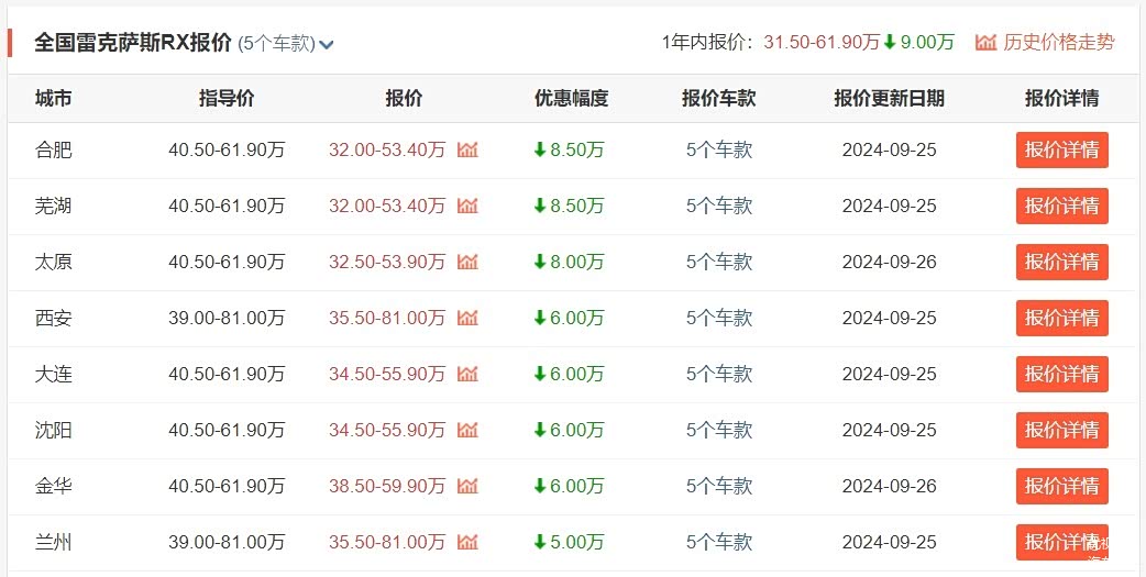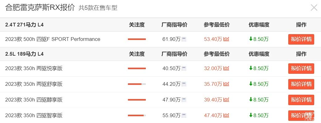 不过话又说回来,8.5万元的最高优惠毕竟是少数地区才可享,如果综合来看的话,全国各地RX车系的优惠大约在5-6万元左右,想买这款车的朋友也还需根据你所在地区的优惠行情去择优进行入手。
