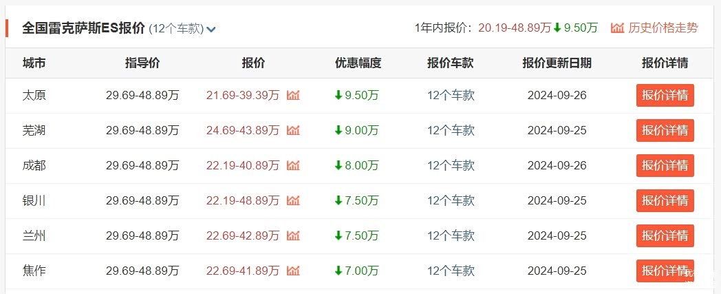 总之,无论是雷克萨斯ES、RX、NX还是他们在新能源汽车市场所推出的RZ车型,眼下雷克萨斯全系都在大降价这也已经是不争的事实。对于咱们国人来说,如果足够喜欢雷克萨斯旗下的某一款车型,那么眼下确实是一个不错的入手时机。如果不喜欢,那就一笑置之吧,毕竟,手里的钱还有很多好的车型可以选,如今的车市显然也已经过了由卖方所主导的年代,因此不用急,大家都能买到适合自己的车。(文/优视汽车 大卓)