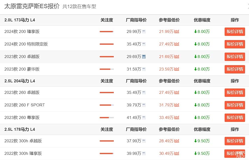 翻看汽车报价网站我们就会发现,指导价29.69-48.89万元雷克萨斯ES车型,目前终端最低已经仅售21.69-39.39万元,最高直降9.5万,最低21万多就能够提裸车,这你受得了吗?