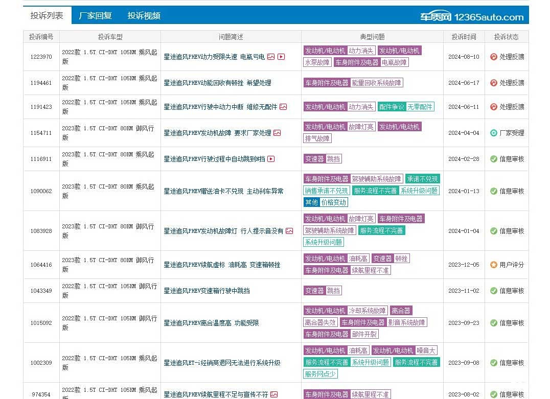 在油电切换的时候,在不同档位的切换的时候,所谓的“3擎3挡9模11速”,本身就会带来更复杂的切换逻辑,和匹配的难度,因此在第一款奇瑞的三挡DHT车型上我们也看到了,这款车几乎是个半成品。而在最新的投诉,也能看到关于奇瑞三挡DHT技术,存在顿挫问题的投诉。除了顿挫还有跳挡失速问题的投诉。