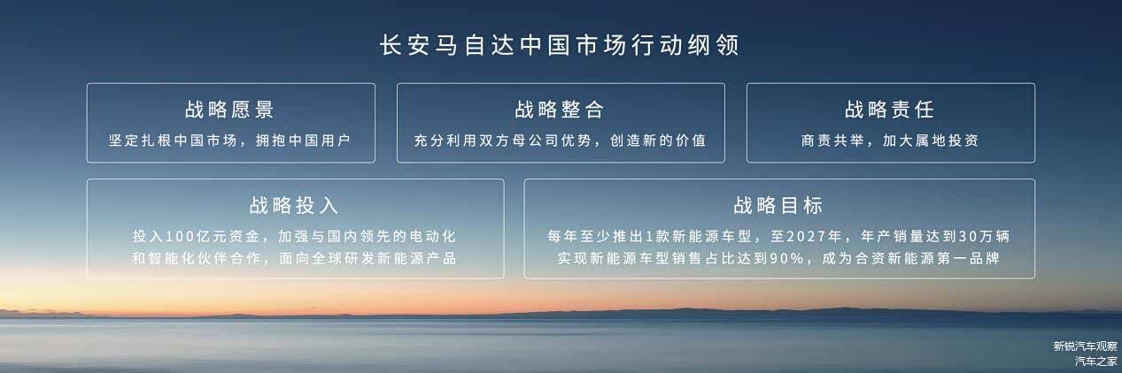 一、战略愿景,坚定扎根中国市场,拥抱中国用户。基于中国市场的电动化和智能化创新成果,坚定推进长安马自达新能源转型,深度融合马自达核心DNA,构建电动化时代的核心竞争力;二、战略整合,充分利用长安、马自达两家百年车企优势资源,夯实全新的合作模式,加强内部业务协同,提升资源共享水平,持续创造新价值,实现高质量可持续发展;三、战略投入,面向2027年,在新能源领域累计投入100亿元,不断加大人才、设备领域的投入,加强与国内领先的电动化和智能化伙伴的战略合作,培育面向全球的新能源产品开发能力;四、战略目标,2024年开始,每年至少向中国市场推出1款新能源车型,不断扩大轿车、SUV细分市场覆盖。2027年力争实现新能源车型销售占比达到90%,年产销量达到30万辆,成为合资新能源第一品牌;五、战略责任,切实履行在中国市场的企业社会责任,提升长安马自达企业、品牌参与者的幸福感。加大属地投资,吸引更多产业配套落户。在南京工厂200万辆累计产销基础上,向下一个200万辆产销周期持续迈进。