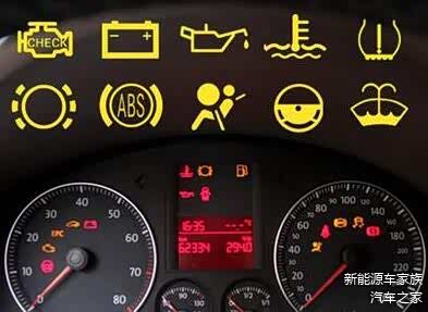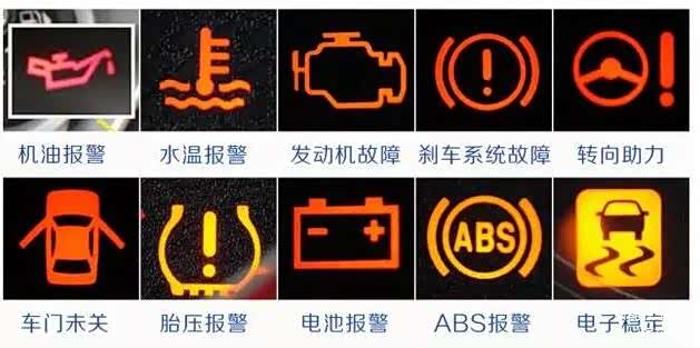 燃油指示灯提示燃油不足的指示灯,该灯亮起时,表示燃油即将耗尽,一般从该灯亮起到燃油耗尽之前,车辆还能行驶约30-50公里左右。水温指示灯显示发动机冷却液温度过高的指示灯,此灯点亮报警时,应即时停车并关闭发动机,待冷却至正常温度后再继续行驶。发动机自检灯发动机工作状态的指示灯,接通电源后点亮,约3-4秒后熄灭,发动机正常。不亮或长亮表示发动机故障,需及时进行检修。电源指示灯显示蓄电池工作状态的指示灯。接通电源后亮起,发动机启动后熄灭。如果不亮或长亮不灭应立即检查发电机及电路。机油指示灯显示发动机机油压力的指示灯,本灯亮起时表示润滑系统失去压力,可能有渗漏,此时需立即停车关闭发动机进行检查。清洗液指示灯显示风挡清洗液存量的指示灯,如果清洗液即将耗尽,该灯点亮,提示车主及时添加清洗液。添加清洁液后,指示灯熄灭。安全带指示灯显示安全带状态的指示灯,按照车型不同,灯会亮起数秒进行提示,或者直到系好安全带才熄灭,有的车还会有声音提示。驻车(手刹)指示灯驻车制动手柄(即手刹)拉起时,此灯点亮。 手刹被放下时,该指示灯自动熄灭。在有的车型上,刹车液不足时此灯会亮车门状态指示灯显示车门是否完全关闭的指示灯,车门打开或未能关闭时,相应的指示灯亮起,提示车主车门未关好,车门关闭后熄灭。ABS指示灯接通电源后点亮,约3-4秒后熄灭,表示ABS(防抱死制动)系统正常。不亮或长亮则表示系统故障,此时可以继续低速行驶,但应避免急刹车。当以上汽车仪表盘故障灯出现时,建议立即停车检查/检修,以避免出现更严重的危害。同时养成检查仪表盘的好习惯,时不时看一看仪表盘是否有什么异常,及早发现问题,及早解决问题。