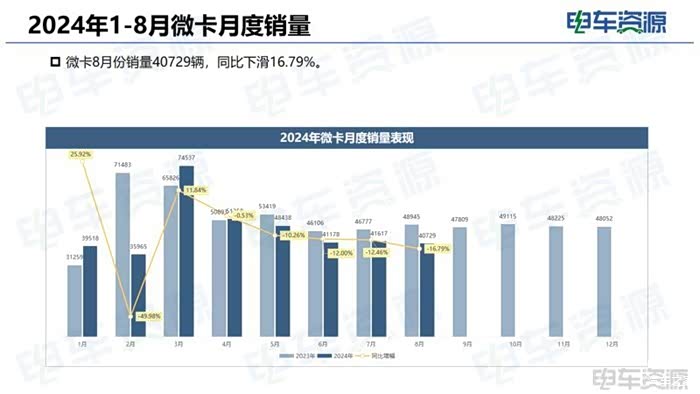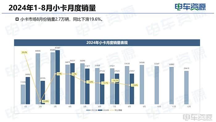 1-8月,微小卡物流车合计销量为61.5万辆,其中燃油微小卡销量为51万辆,较去年同期下降17.7%。1-8月,新能源微卡共销售30795辆,新能源渗透率8.2%。新能源小卡的销量为27742辆,新能源渗透率达11.5%。