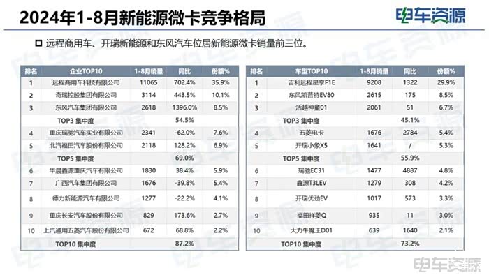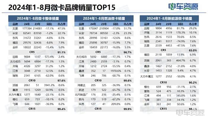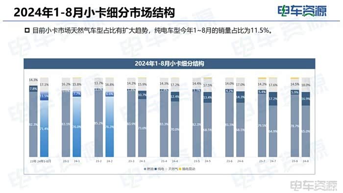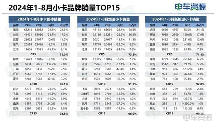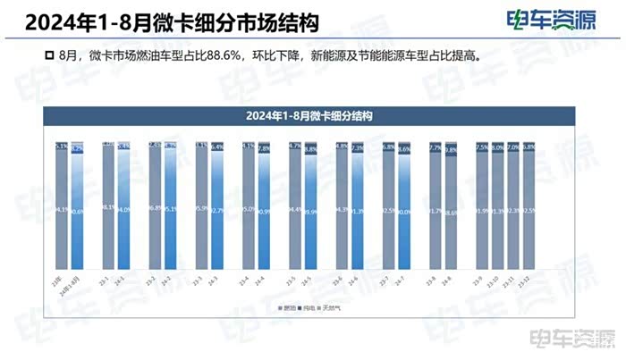 动力类型:微卡市场:2024年1-8月燃油车占比90.6%,相比2024年全年下滑3.5%;2024年1-8月新能源车型占比为8.2%,天然气车型占比为1.1%。