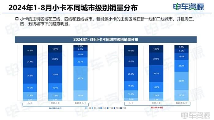 1-8月新能源小卡销量主要集中在广东、江苏、四川等省份,从城市等级来看,新一线城市销量占比较去年同期下降10.7%,二、三、四、五线城市销量占比较去年同期有不同程度的上升。