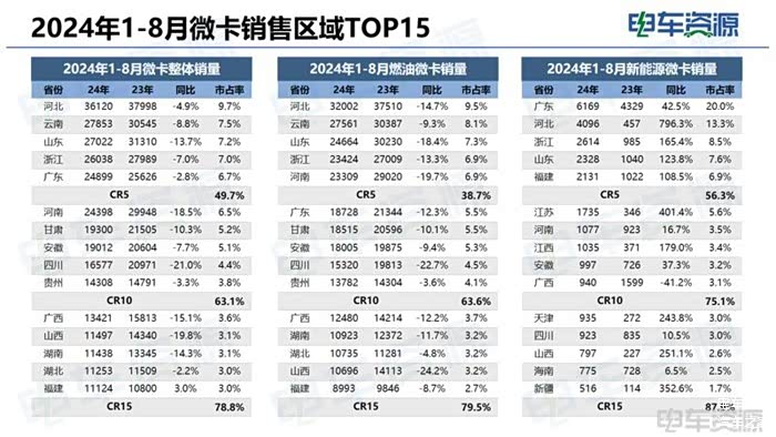 小卡市场:2024年1-8月燃油车占比71.4%,较2023年全年下滑明显;2024年1-8月新能源和节能能源动力类型(纯电、天然气、插电混动)占比约为29%,其中,我们发现天然气小卡车型的销量占比有扩大趋势,8月销量占比达到18%,持续高于新能源车占比;而新能源小卡今年销量增速明显,全国TOP15区域全部呈现三位数增幅,新能源渗透率峰值来到17.5%。从微小卡整体动力类型来看,新能源渗透空间大,且渗透速度加快。
